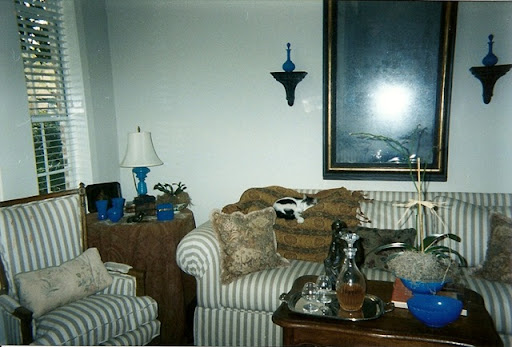 This pictures was taken a few years after we moved in our new home in Houston. I can tell, because I've already gotten rid of the ethnic skirt and replaced it with a paisley shawl. Also, the white pillows are now long gone. That's my cat Quilty sleeping on a paisley shawl. The opaline collection has grown a little. That's an opaline lamp that I had bought at my mother's antique store she had. The lamp has since broken in pieces!!