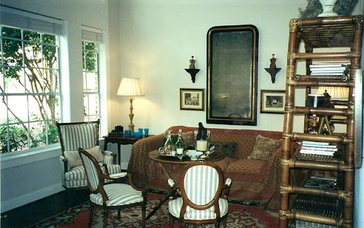 An early version of the post Carithers stripe/English landed gentry look. The new tiny sofa sits under a collection of celadon plates. I bought a needlepoint rug to sit on top of the seagrass rug. The blinds are finally gone. The walls have been painted. The chairs and pillows are Bennison. My garden lady is stuck in the corner then.