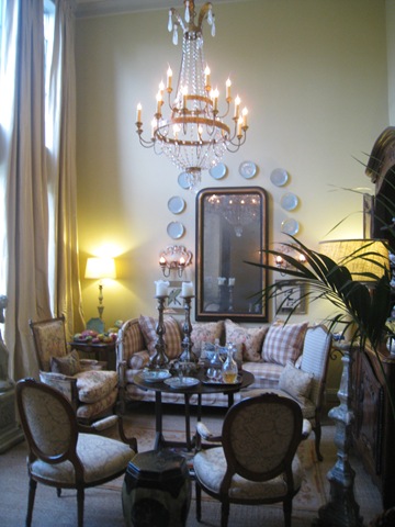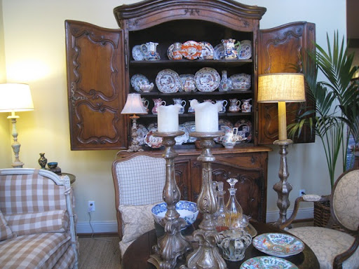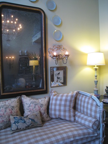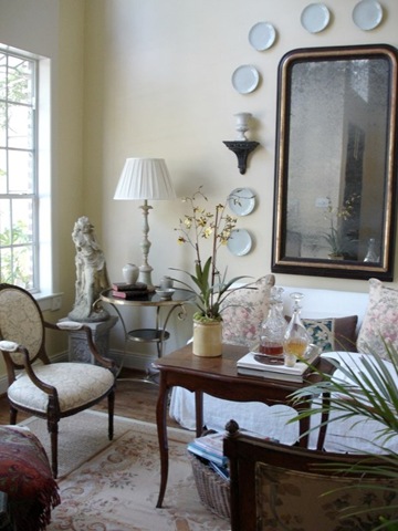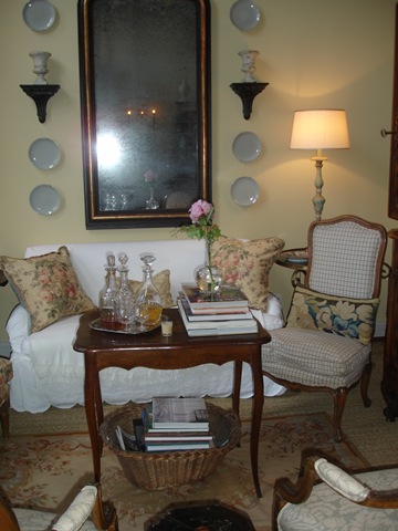 When Katrina devastated New Orleans, Antique store owner Tara Shaw was stuck without a place to sell her new shipment. Tara owns the eponymous Tara Shaw where she sells French, Italian and Swedish antiques to the trade only. Really. No cheaters - its the real thing. She came to Houston to open a new store and took Houston by a storm, which is probably a bad choice of words, considering. Everyone in the design business went crazy at her prices - they were unbelievably low - honest, true, trade prices - something Houston had never seen before. Of course, I had to get in on the fun. Loaded down by a commission check, I bought a buffet a deux for my living room from Tara and promptly filled it up with Masonware from England. The new antique piece towered over my poor little pincushion of a sofa. So, one day, I spied a green antique French daybed at Tara's. I had it painted Swedish gray, but instead it came out lavender and Don from Custom Creations saved the day when he repainted it a whitish taupe-y color for me. Ceci, also from Custom Creations, made the slipcovers for the daybed, again with a scalloped hem. The pincushion was banished to my master bedroom, replacing the Pottery Barn chairs up there. Finally, after 14 years in our house, I had a living room with a sofa (sort of) that fit the room properly. So, I was through with that room! Finished. Happy......