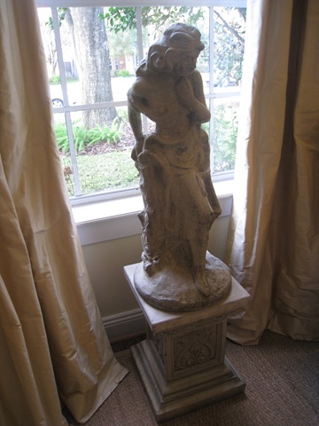The garden lady statue is now in between the front windows. The windows are softly draped with silk which hides a lot of hard angles. The store bought seagrass has been replaced with a custom cut piece that fits just up to the molding, as it should.