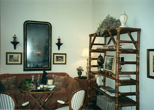 As time went on, I started getting into an English landed-gentry design phase and tried to pretend that I was living in Dorset or Gloucestershire in an ancient English country home. Hence, the changes in the living room during this phase: I had a batik bedspread covering the striped sofa, I bought bamboo furniture (couldn't really afford anything else), there were wool paisley scarves over tables and anything else I could cover, and there was a huge bamboo shelving unit that I bought from Shabby Slips (before they were ultra chic). I just HAD to have that shelving unit and bought it on impulse, probably motivated by how inexpensive it was. Boy, these pictures are REALLY humiliating!!! Nothing actually fit properly in the room. The striped sofa was always too big for the space and that shelving unit was terrible from day one. It finally dawned on me that I wasn't Prince Charles' neighbor (not that I had fooled anyone) and something had to give. My nephew took the shelves off my hands and the Urban Outfitters bedspread went into hiding. By this time, I was sick to death of the striped fabric which was no longer trendy, but terribly dated. I wanted a total change for the room, but just had no direction and no idea of where to take it.