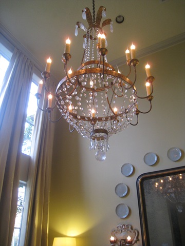 There was still one thing missing from the room that I had planned to buy, if I could ever find it. One day last year, I was at Tara's (of course) when I spied a crystal chandelier - antique, but not period. It was a French Empire light fixture. There had been one just like it before that was "mine." At least, I thought it was mine, I was promised it was mine, but that other fixture got sold out from under me by mistake. And there was yet another one after that that was sold before I could buy it. I didn't want to lose another chandelier that I loved again, so I bought the one at Tara's after thinking on it for a few days. The great people at Alcon fixed it up for me - wired it, cleaned it, put it all back together, replaced missing crystals, and gave it new sleeves. And yesterday, it came home: