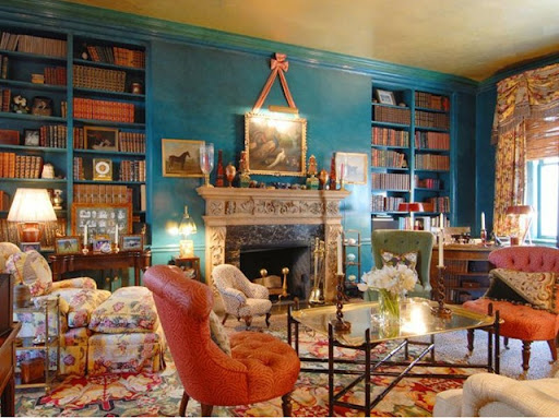 The turquoise library. Does the bow on the painting over the mantel give a clue as to who the designer is?