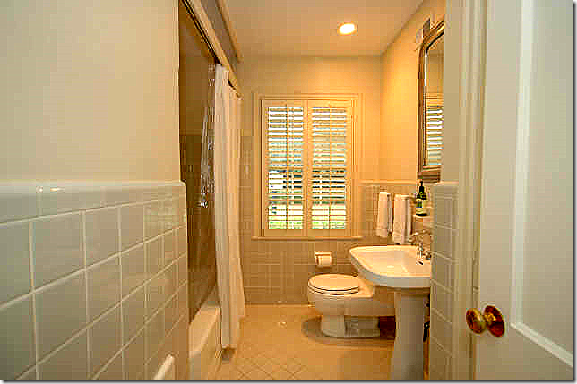 The second bathroom is softened with a custom made linen shower curtain and sink skirt. Another linen is used as a shade.
